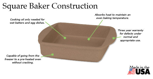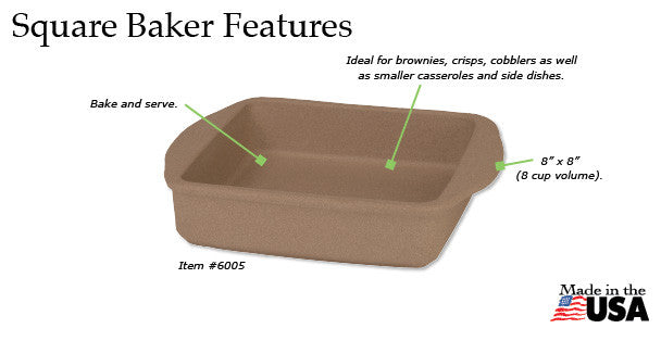 The Rada 8" x 8" Square Baker is just the right size for brownies, crisps and cobblers as well as smaller casseroles and side dishes. Rada Stoneware absorbs heat to maintain an even baking temperature so you can experience superior results, the textured surface produces fluffy and light cakes and brownies and perfectly browned casseroles and desserts. Unlike most other brands of stoneware, our stoneware is dishwasher safe! This is possible because our proprietary clay mixture and manufacturing process minimizes moisture absorption. Now you can prepare recipes ahead of time because Rada Stoneware can go directly from the freezer to a pre-heated 400 degree oven without cracking.